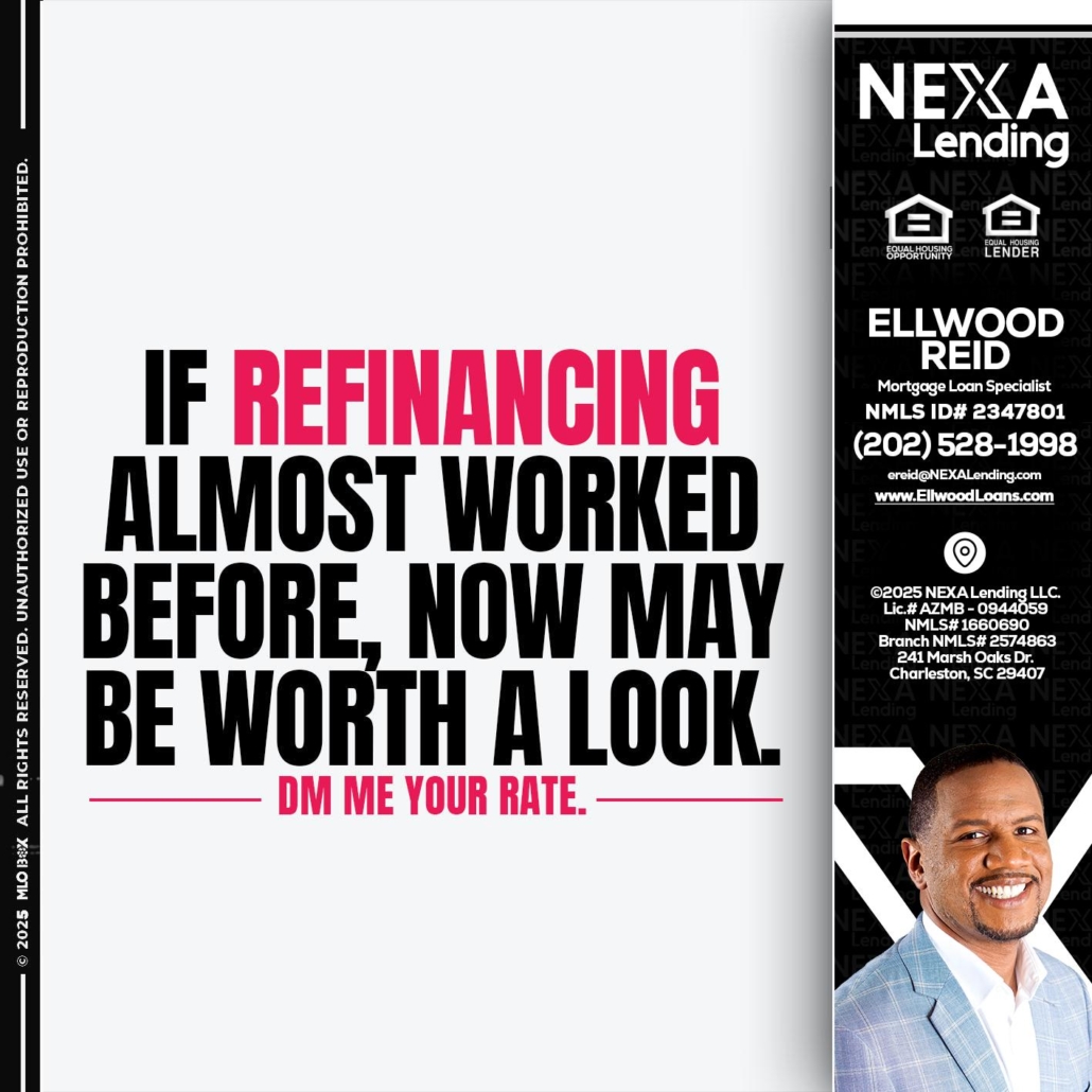 if refinancing - Ellwood Reid -Mortgage Loan specialistHi, my name is Ellwood Reid. I’m a Loan Officer with NEXA Lending LLC., offering personalized mortgage solutions, fast customized quotes, great rates and service with integrity.