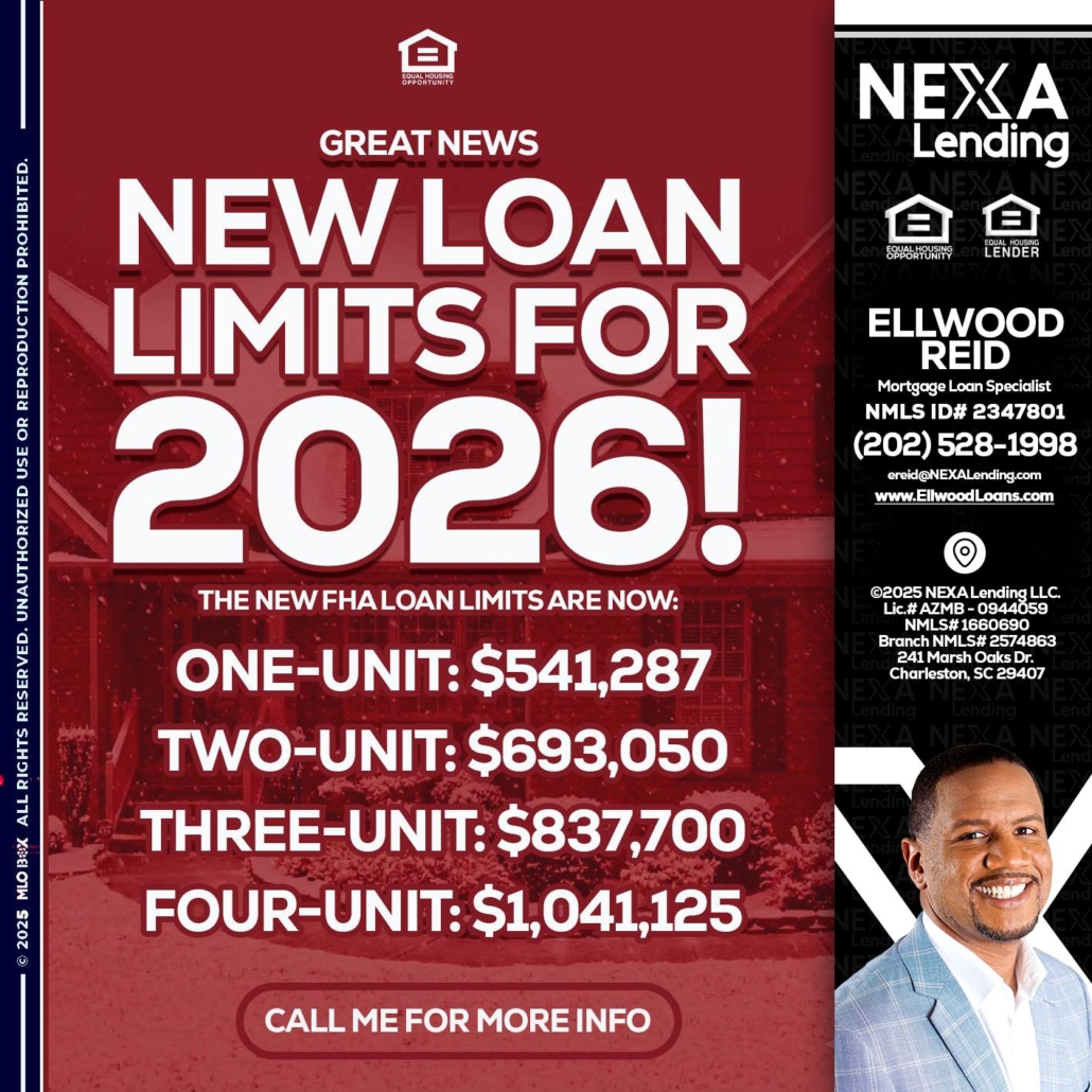 loan limits - Ellwood Reid -Mortgage Loan specialistHi, my name is Ellwood Reid. I’m a Loan Officer with NEXA Lending LLC., offering personalized mortgage solutions, fast customized quotes, great rates and service with integrity.