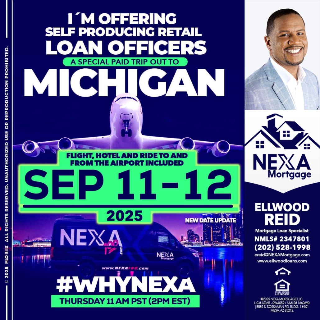 michigan sep 11-12 - Ellwood Reid -Mortgage Loan specialistHi, my name is Ellwood Reid. I’m a Loan Officer with NEXA Mortgage LLC., offering personalized mortgage solutions, fast customized quotes, great rates and service with integrity.