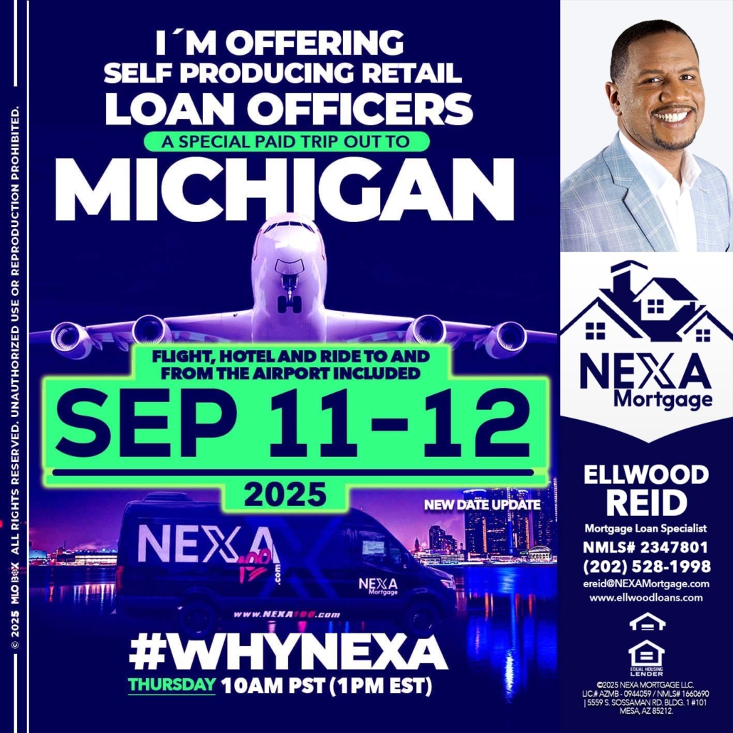 MICHIGAN TRIP - Ellwood Reid -Mortgage Loan specialistHi, my name is Ellwood Reid. I’m a Loan Officer with NEXA Mortgage LLC., offering personalized mortgage solutions, fast customized quotes, great rates and service with integrity.
